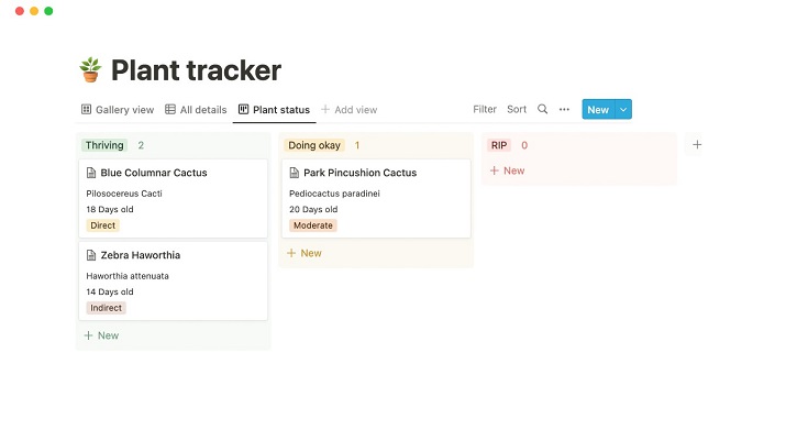 Utilisez ce modèle pour enregistrer des informations pertinentes sur les différentes plantes que vous avez, telles que les mises à jour de statut, les images de progression, les conditions d'éclairage dont elles ont besoin, leur calendrier d'arrosage et les problèmes courants qui les affectent.