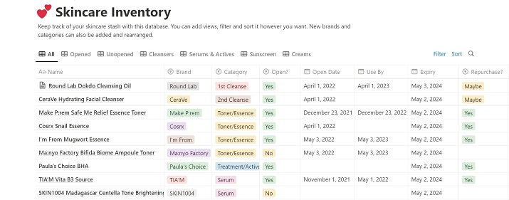 Si vous aimez les soins de la peau et la beauté, utilisez ce modèle pour répertorier les produits que vous utilisez ou que vous souhaitez essayer. Vous pouvez regrouper les produits par catégorie, articles ouverts et articles ouverts.