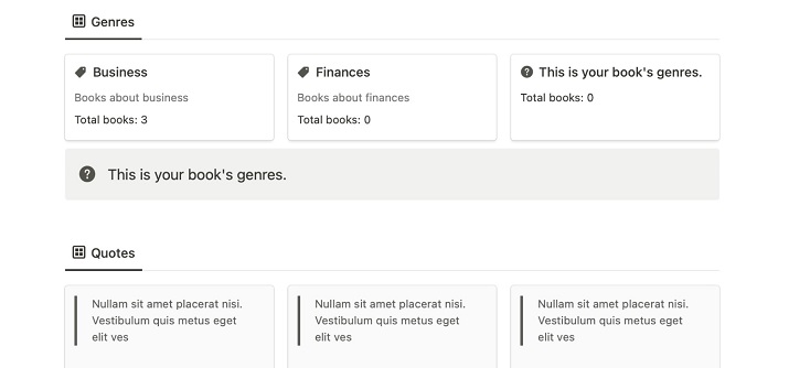 Ce modèle Notion gratuit est conçu pour les personnes qui souhaitent améliorer leurs habitudes de lecture ou suivre leur liste de lecture, c'est-à-dire les livres qu'ils ont lus, qu'ils veulent lire ou qu'ils lisent actuellement. Il sert d'étagère numérique où vous pouvez classer vos livres en genres et noter vos citations de livres préférées afin de toujours les trouver.
