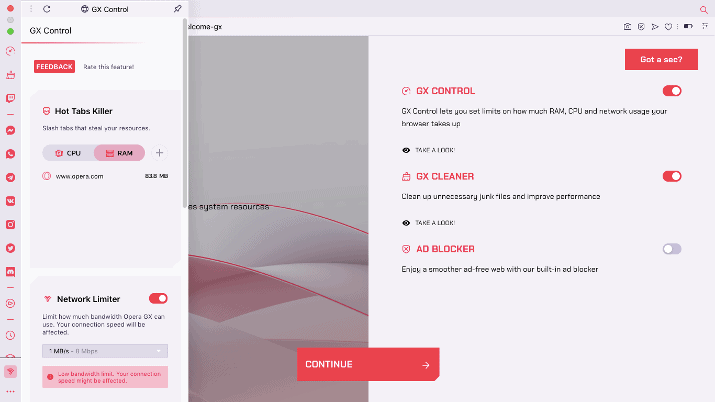 Une chose qui fait d'Opera GX un superbe navigateur de jeu est qu'il vous permet de limiter votre consommation de CPU, de RAM et de bande passante. Ce sont trois choses distinctes :