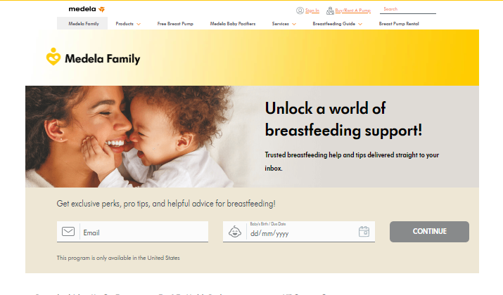 Pour vous inscrire à Medela Family, visitez le site Web officiel de Medela et cliquez sur « Medela Family », entrez votre adresse e-mail et la date d'accouchement de votre bébé, puis « Continuer » avec le reste du processus de remplissage du formulaire.