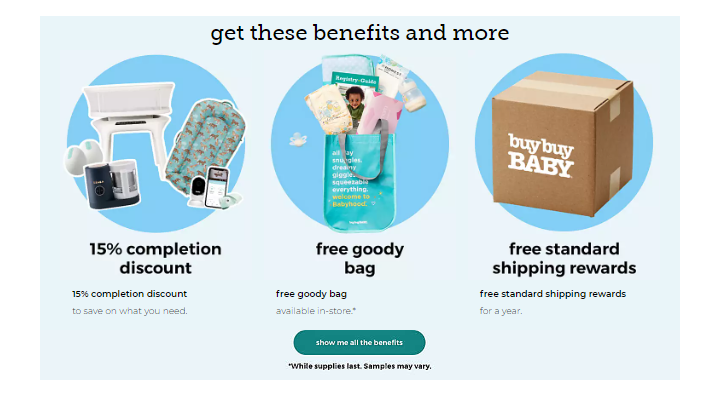 Lorsque vous vous inscrivez au sac de cadeaux gratuit de buybuy BABY, vous obtenez un coupon gratuit de buybuy BABY, des échantillons de produits et un accès gratuit aux consultants experts du registre. De plus, vous bénéficierez également d'une remise de 15% sur toutes les commandes.
